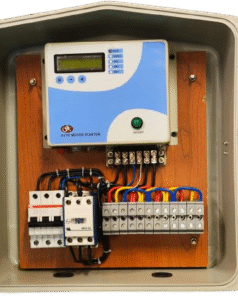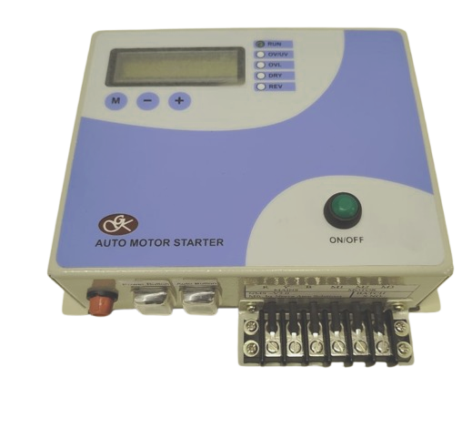 The 20 Amps or 4-in-1 Starter is designed to control and protect motors up to 10 HP, operating on a 3-phase 440V, 50 Hz AC supply. With a current handling capacity of 20 amps, this starter is ideal for larger motor applications such as aerators, pumps, and industrial machines. It combines multiple functionalities in one compact unit, including Auto Mode (timer-based), Manual Mode (push-button), Overload Protection, and Phase/Voltage Protection, hence the “4-in-1” name.
